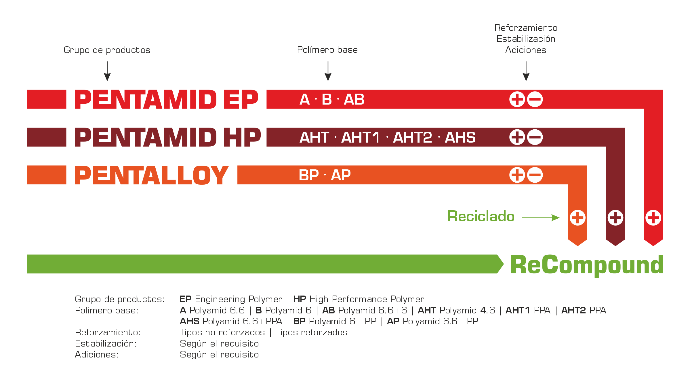 PENTAC Polymer ofrece una gama de productos amplia, sostenible y respetuosa con el medio ambiente en el área de recompuestos. Los ReCompounds se basan en valiosos reciclados postindustriales como polímeros base, como PA-6, PA-6.6, PA-6.6+6, PA-4.6, PPA, PA-6.6+PPA, PA-6+ABS, PA- 6+PP y PA-6.6+PP. Las propiedades de calidad de estos productos aumentan enormemente mediante la adición de refuerzos de fibra de vidrio, estabilizaciones y el uso específico de aditivos, de modo que se alcanzan las propiedades de los productos 1-A.
